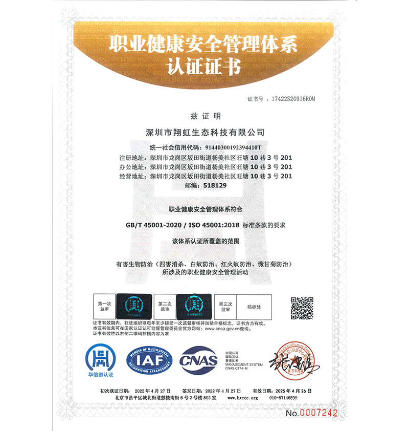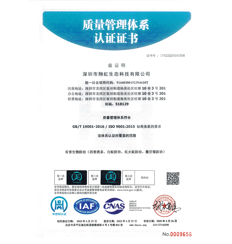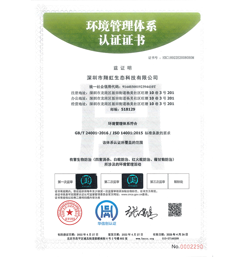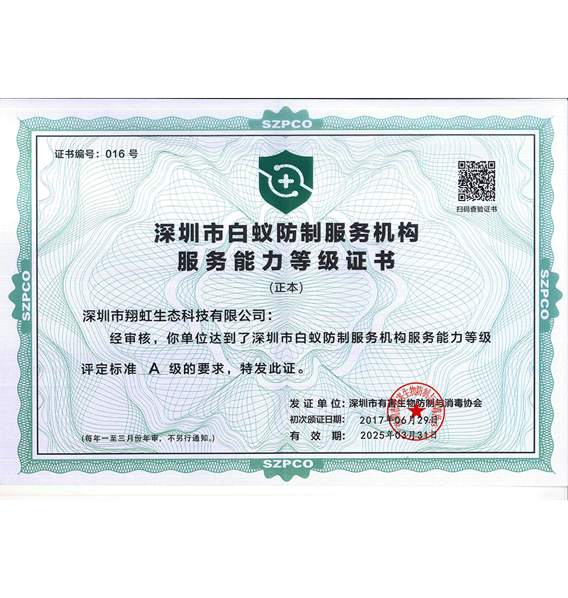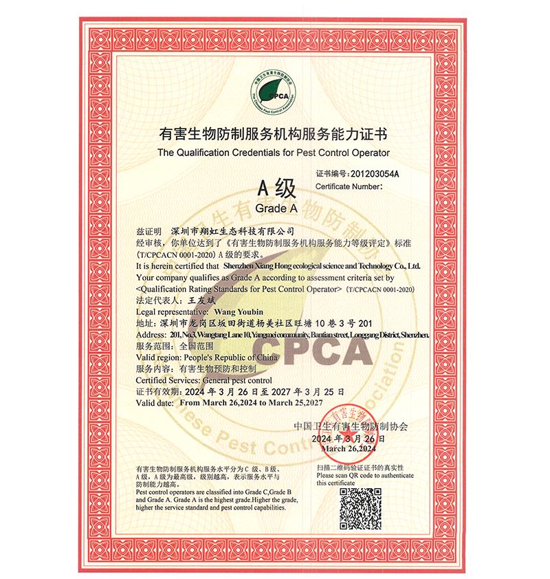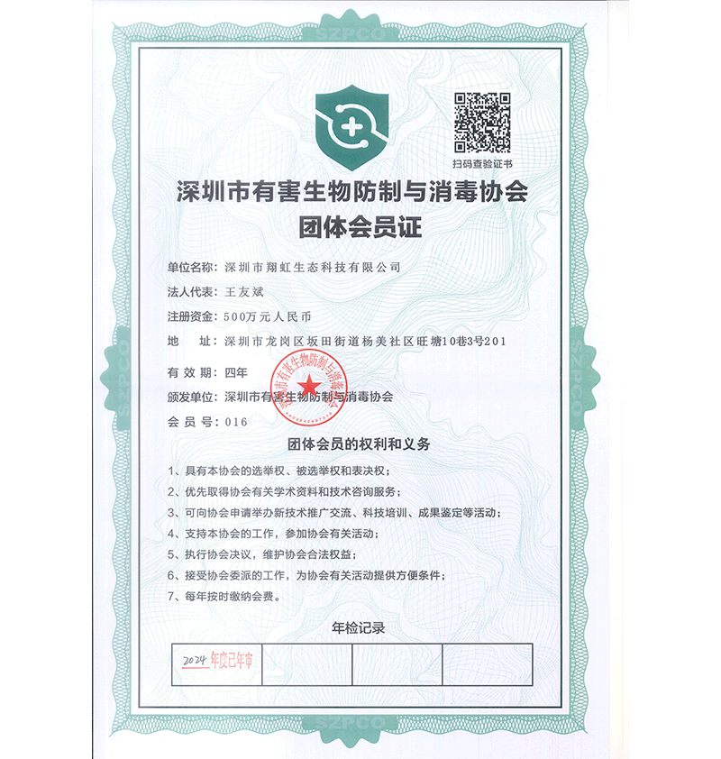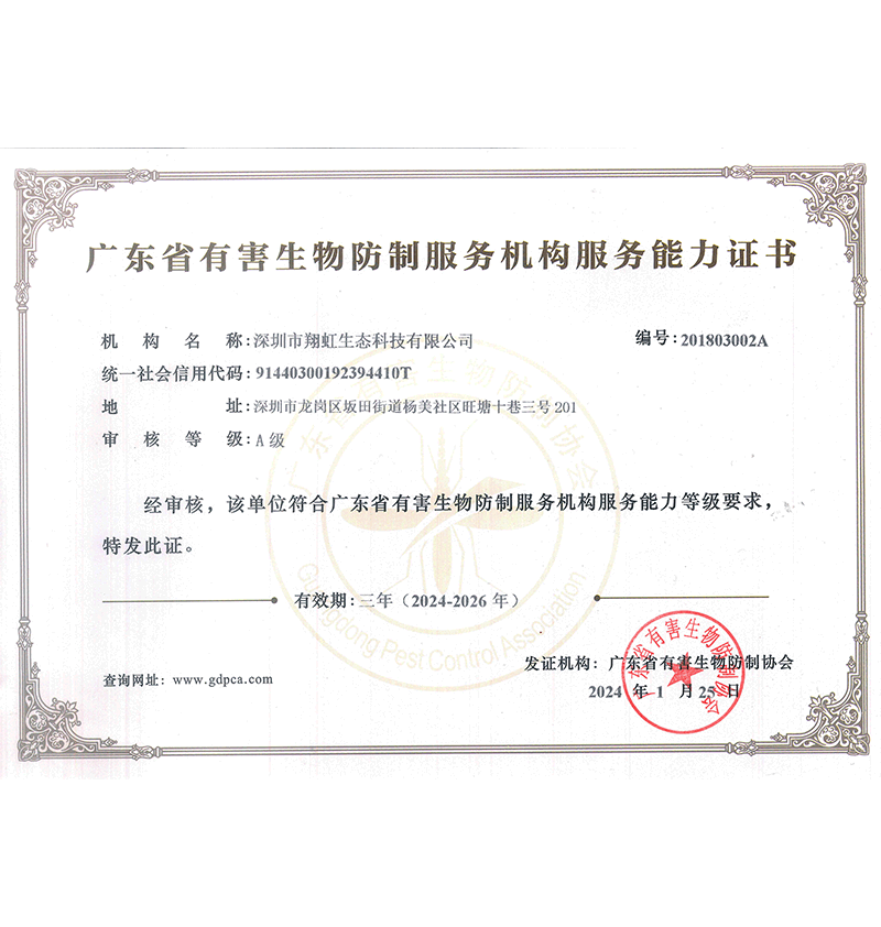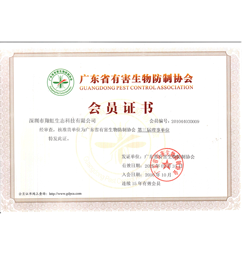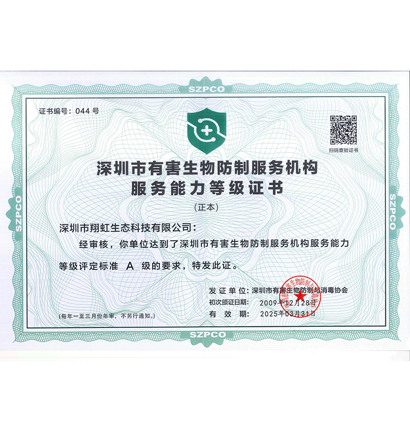 深圳市翔虹生態(tài)科技有限公司成立于1995年,是深圳最早成立的專業(yè)蟲害防治公司之一。公司發(fā)展至今獲得全國有害生物防制服務A級資質、廣東省有害生物防制服務A級資質、深圳市有害生物防制服務A級資質、廣東省有害生物防制服務A級資質、深圳市有害生物防制服務甲級資質的單位,是中國有害生物防治協(xié)會會員、廣東省有害生物防治協(xié)會會員、深圳市有害生物防治協(xié)會理事單位,多次獲得“深圳市十佳消殺單位”榮譽。